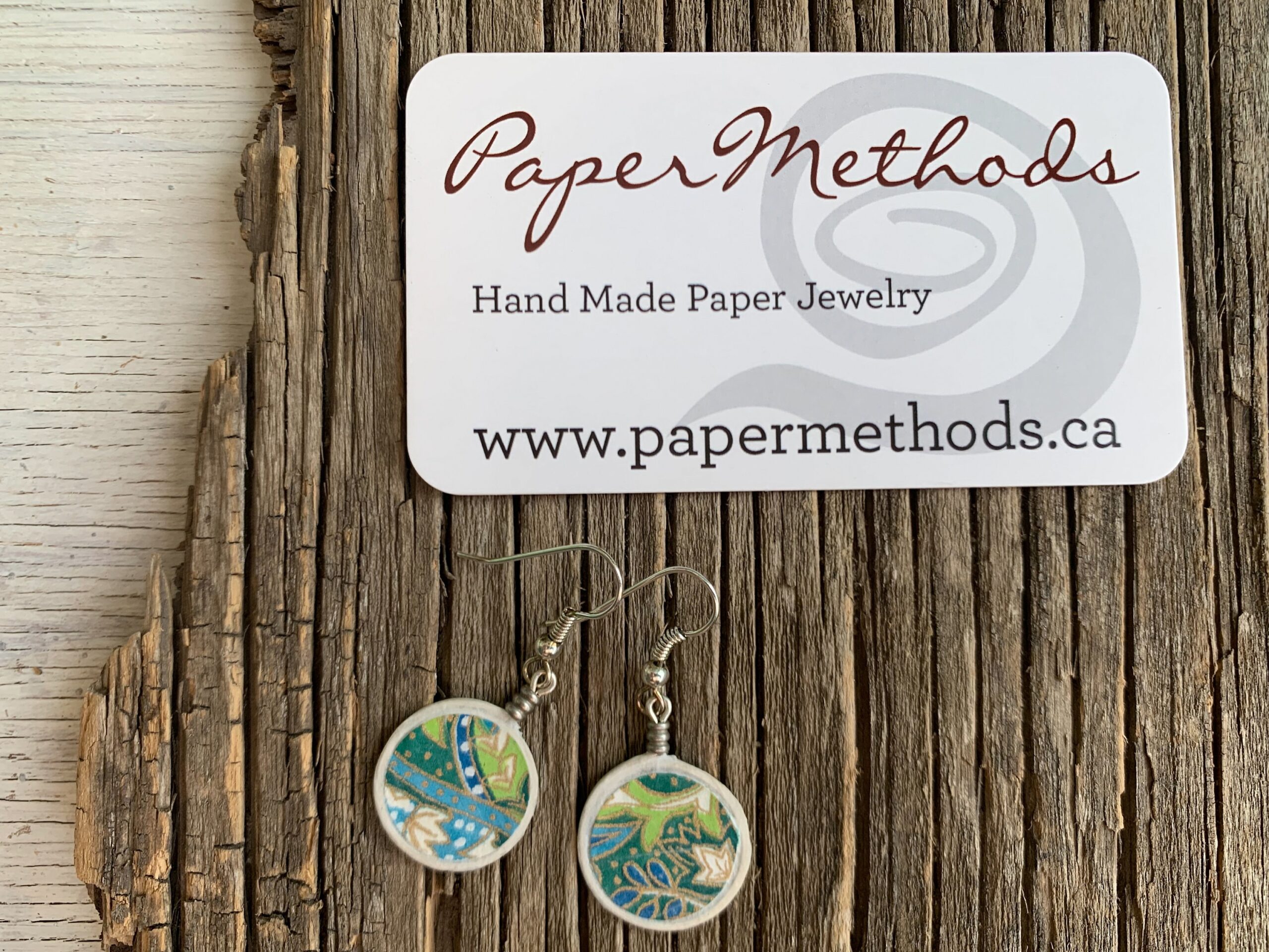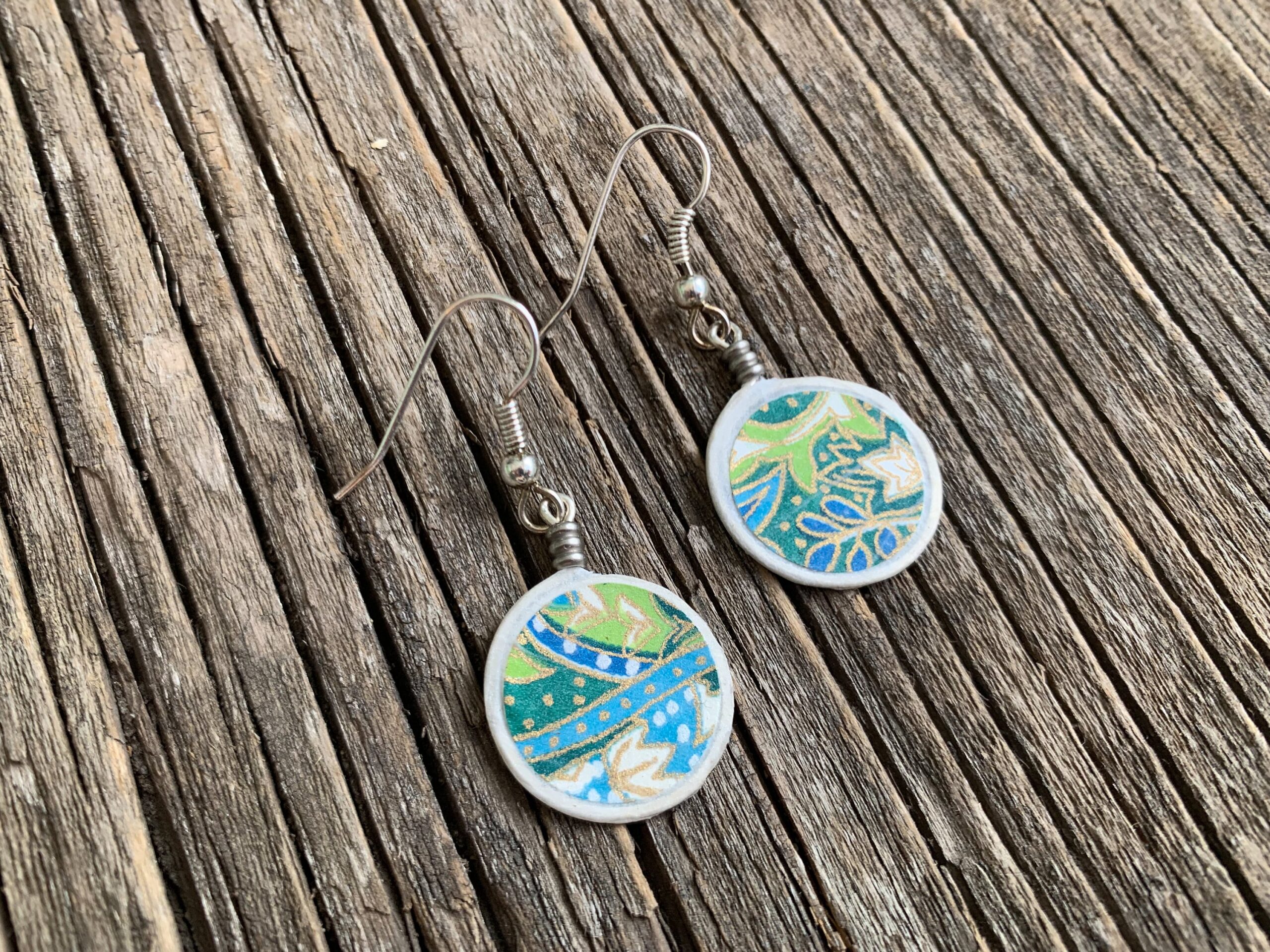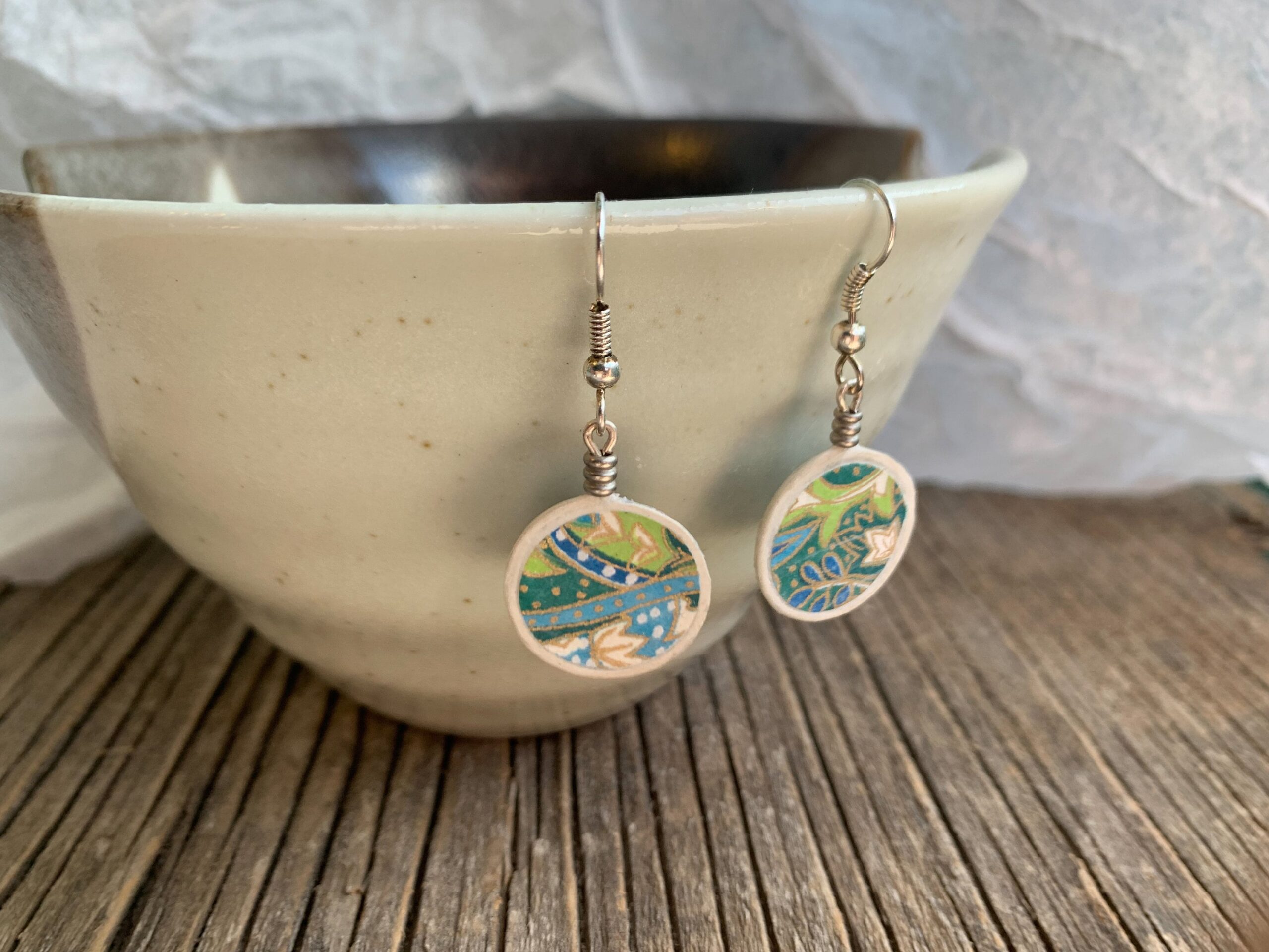 I like to call these types of earrings Paper Moons. These Japanese Chiyogami Paper Moons are made by creating a wire form and carefully attaching a base layer of repurposed tissue paper and medium. Once dry, Japanese Chiyogami paper is applies to each side creating the finished look. Once cured they are sealed with acrylic medium for durability and water resistance. They come with surgical steel hooks but can be switched to silver for additional charge.