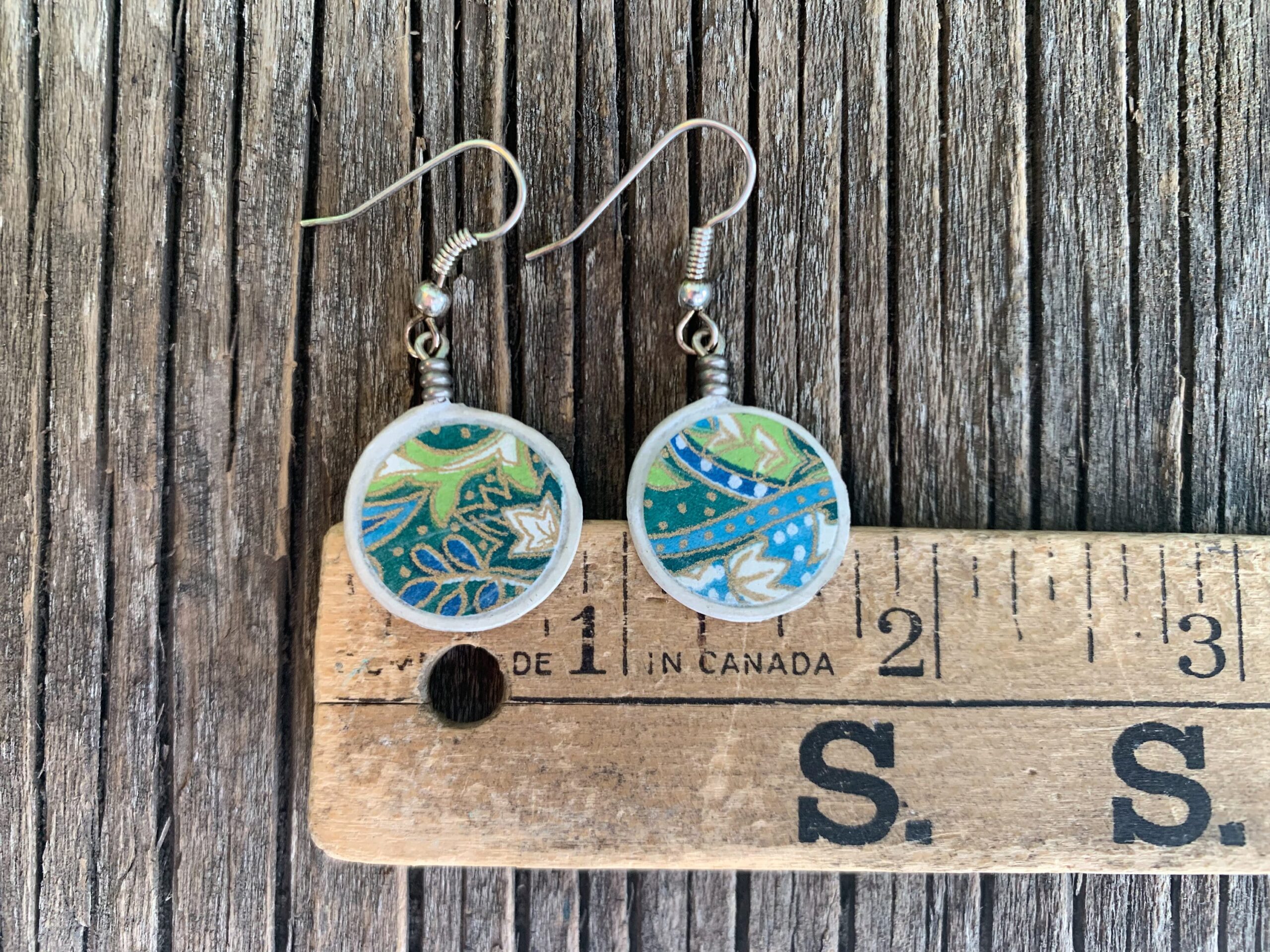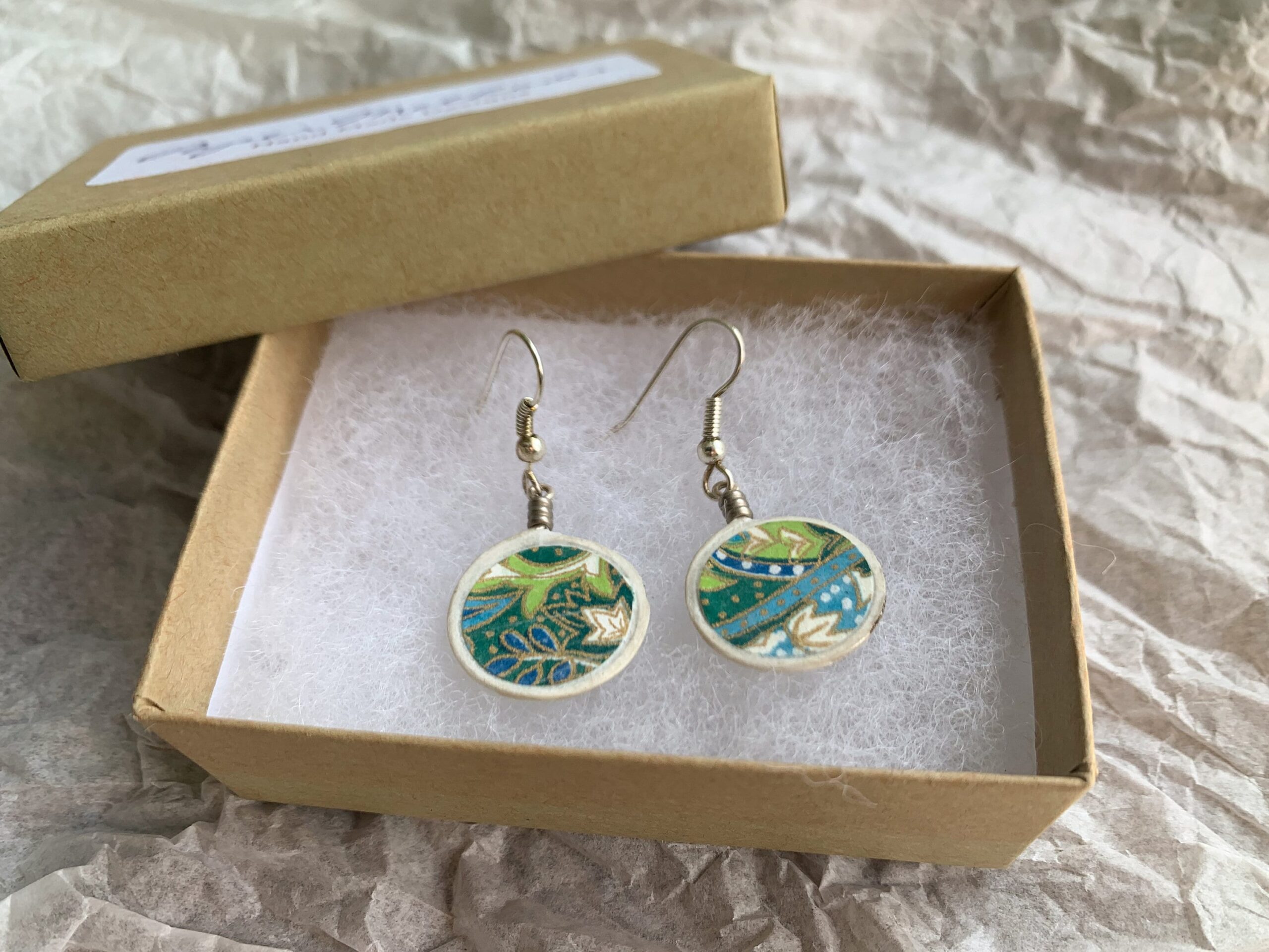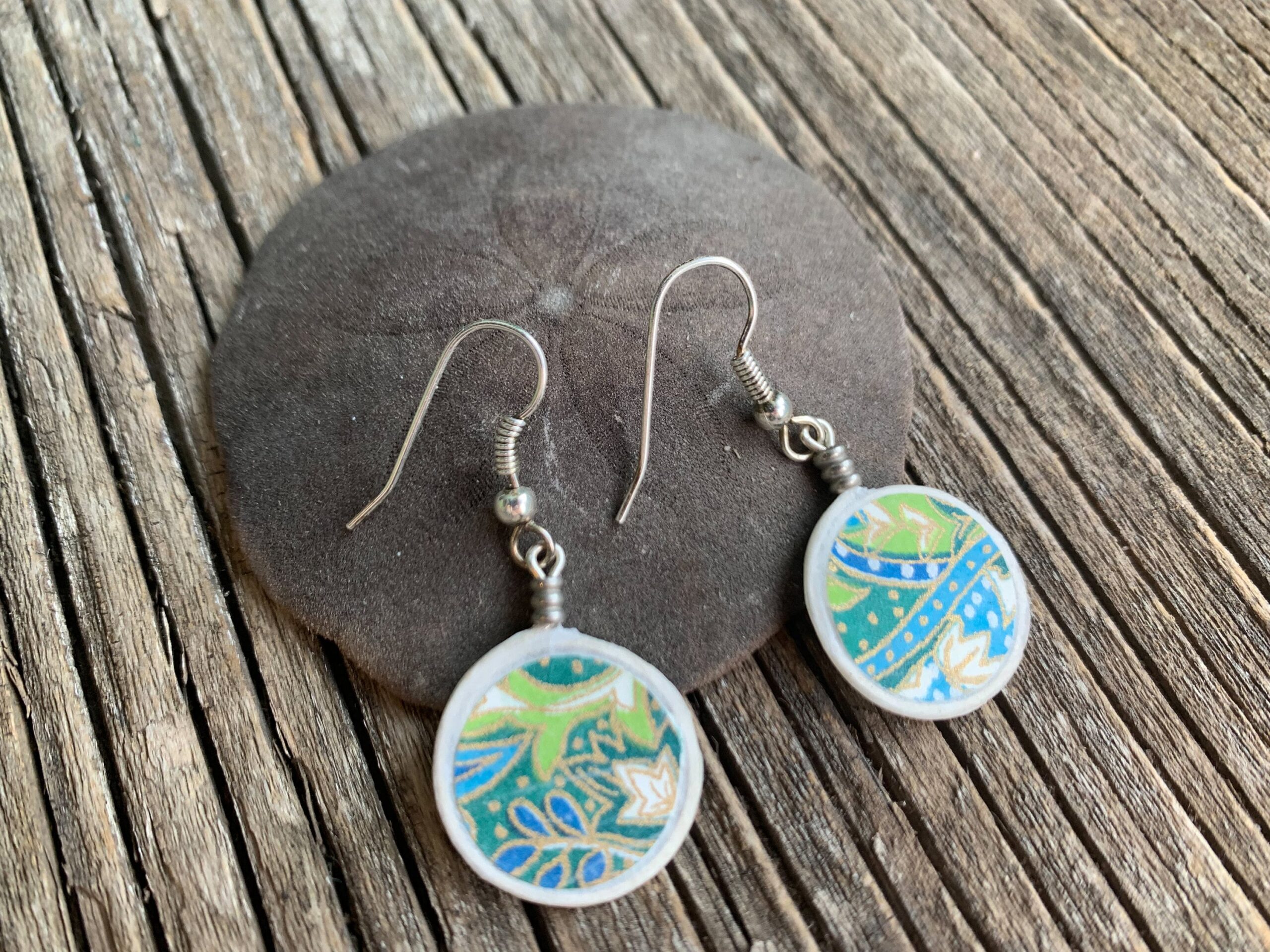 I like to call these types of earrings Paper Moons. These Japanese Chiyogami Paper Moons are made by creating a wire form and carefully attaching a base layer of repurposed tissue paper and medium. Once dry, Japanese Chiyogami paper is applies to each side creating the finished look. Once cured they are sealed with acrylic medium for durability and water resistance. They come with surgical steel hooks but can be switched to silver for additional charge.