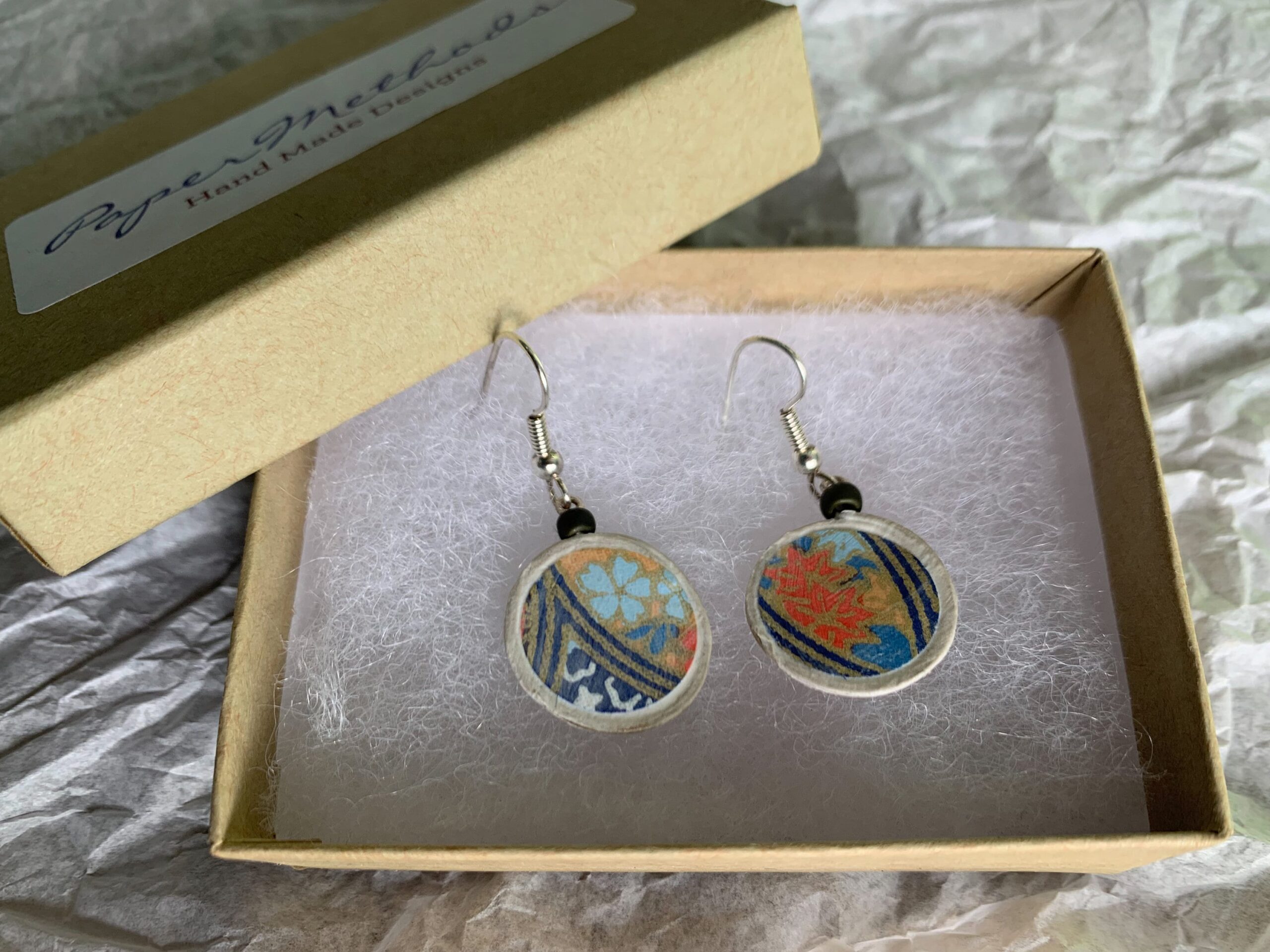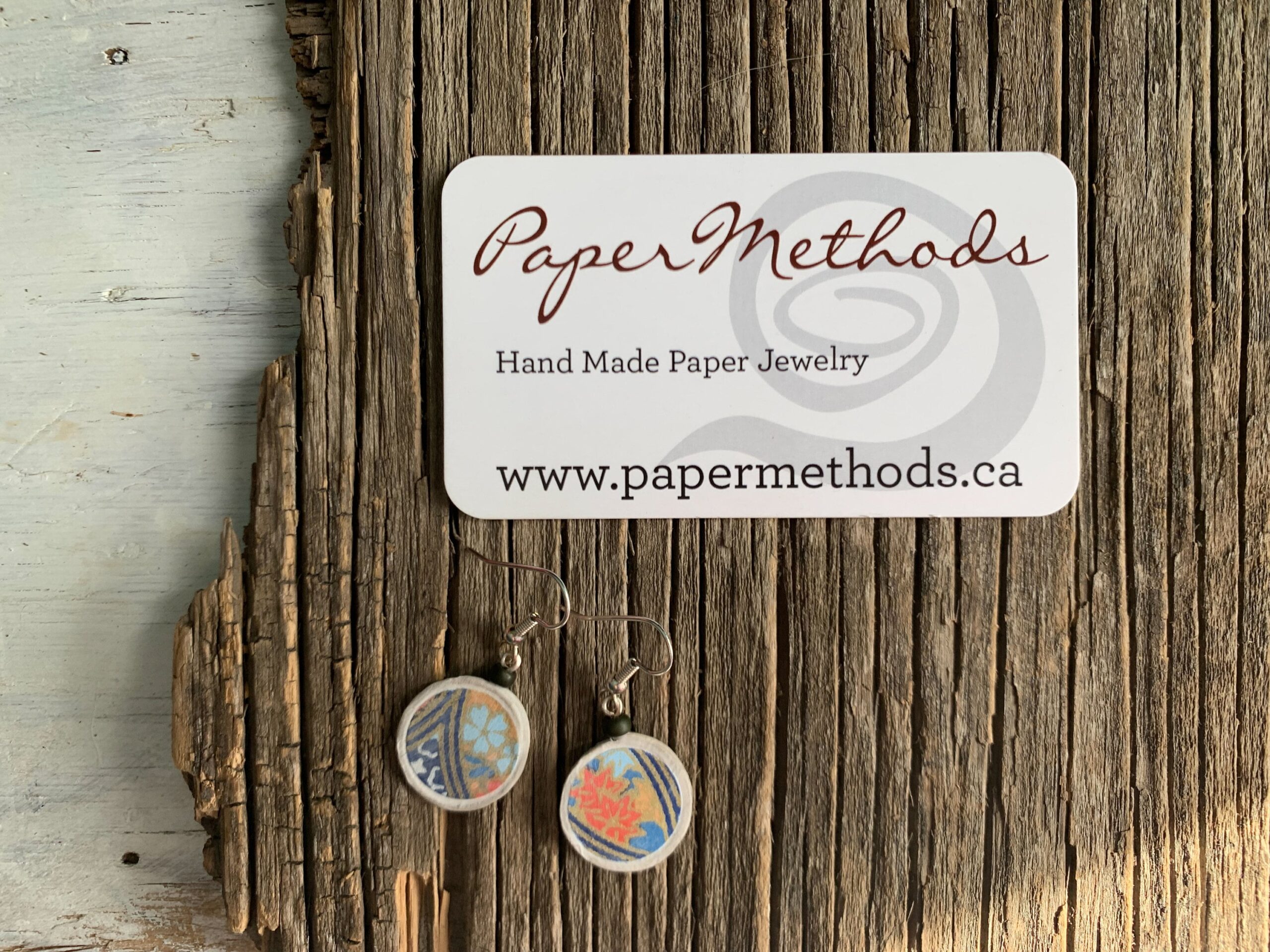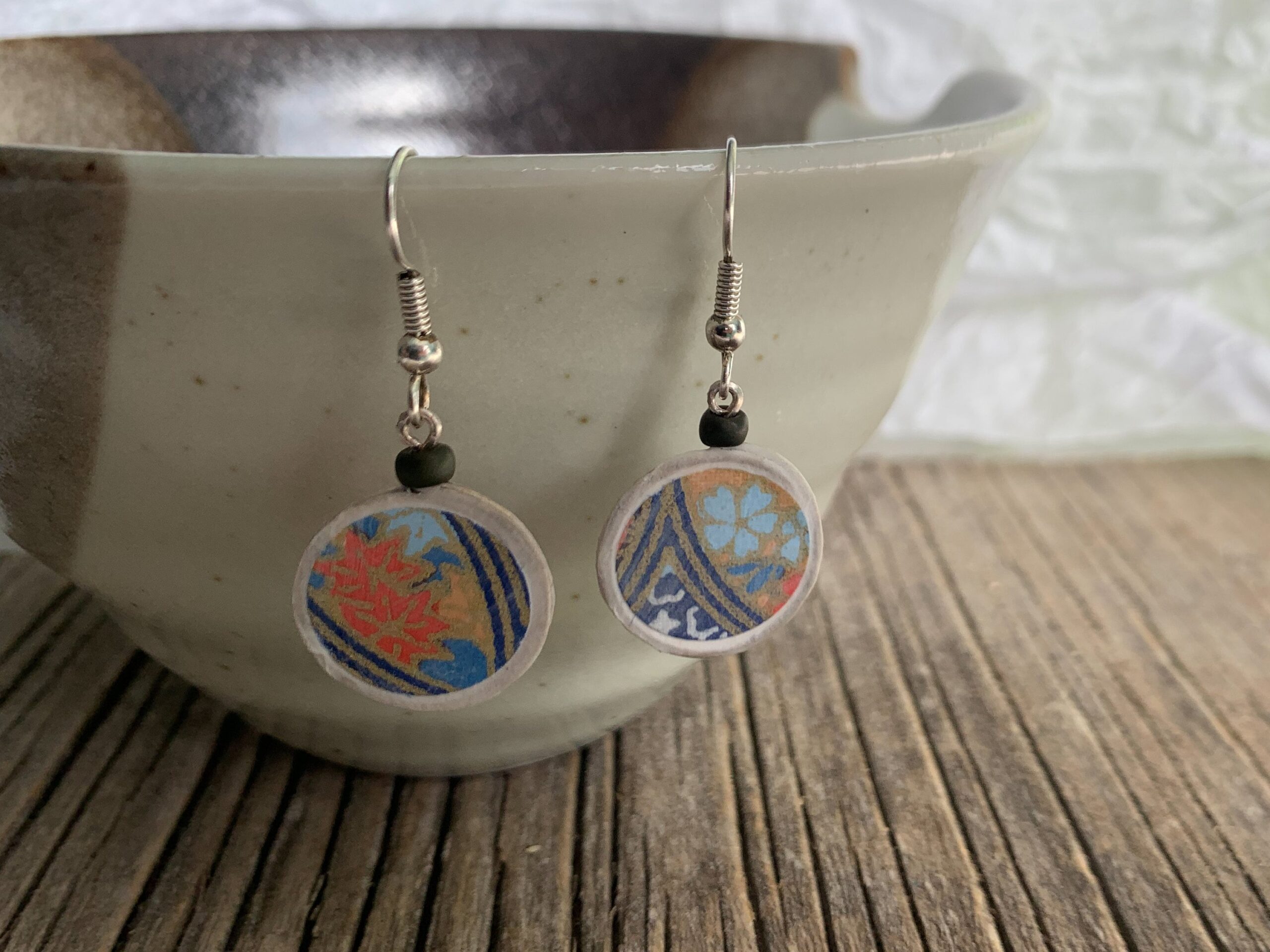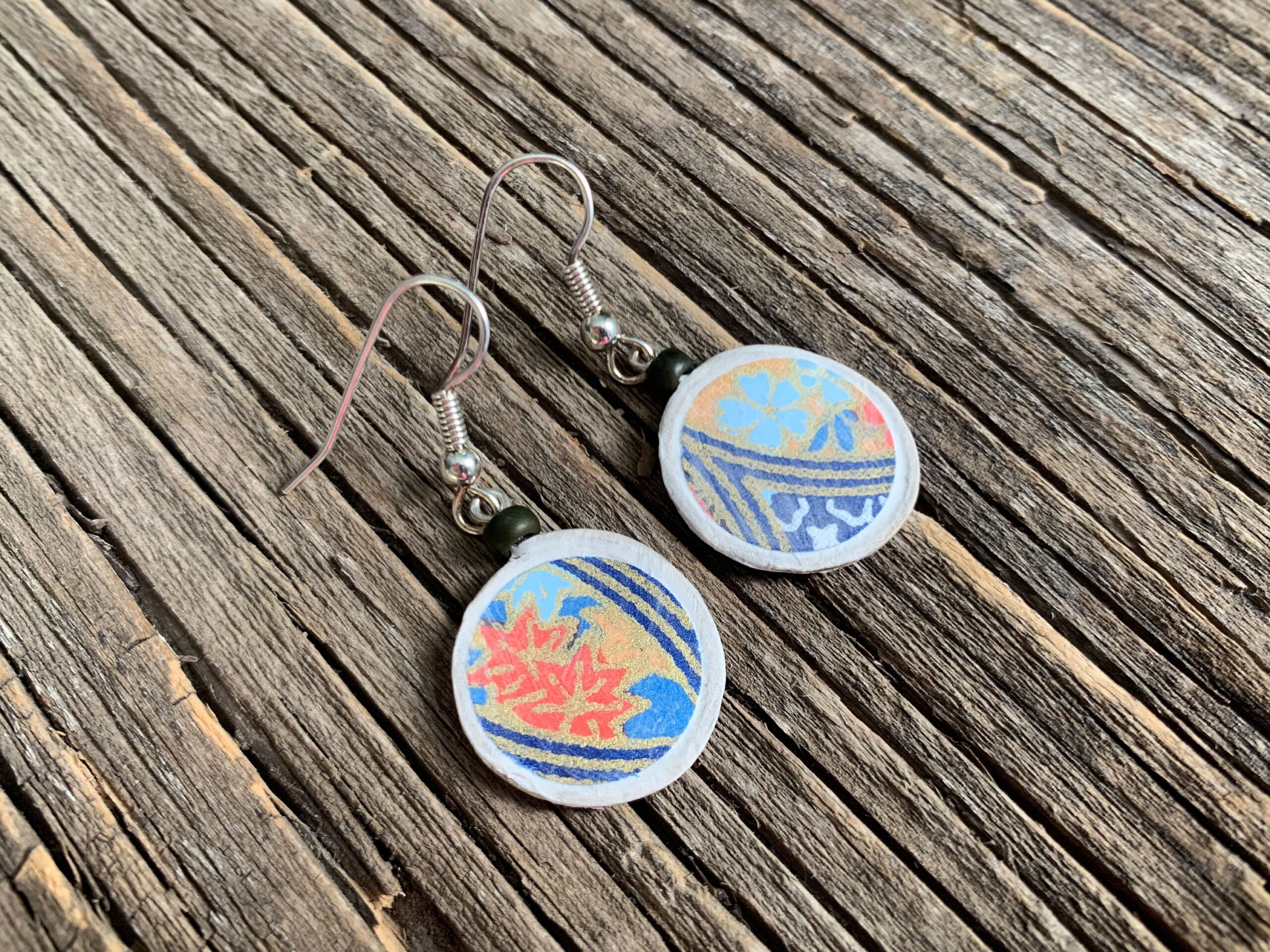 I like to call these types of earrings Paper Moons. These Japanese Chiyogami Paper Moons are made by creating a wire form and carefully attaching a base layer of repurposed tissue paper and medium. Once dry, Japanese Chiyogami paper is applies to each side creating the finished look. Once cured they are sealed with acrylic medium for durability and water resistance. They come with surgical steel hooks but can be switched to silver for additional charge.